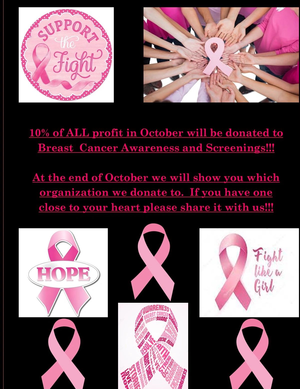 The entire month of October we will donate 10% of all profit to help fight breast cancer. We want to do our part in helping save lives!